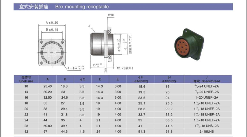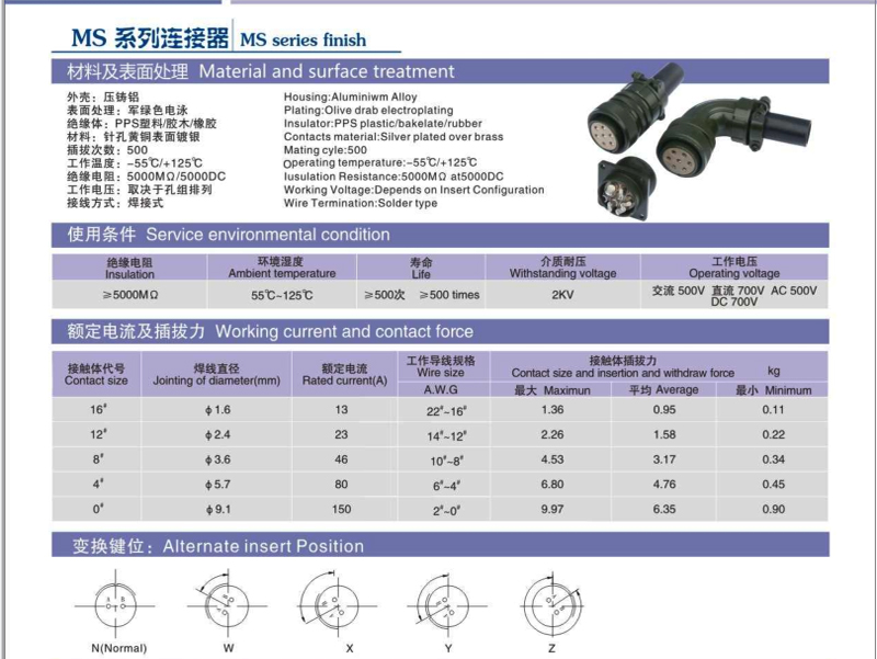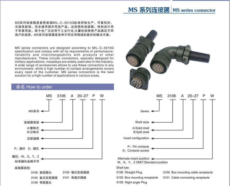 MS3106A22-2PW防水密封航空插頭,完全符合美軍標MIL—C—5015的技術(shù)要求, 完全通用國外MS等同系列產(chǎn)品。產(chǎn)品具有重量輕,規(guī)格多,鋁合金殼體,螺紋連接,良好的密封和防水性能,耐腐蝕,良好的導(dǎo)電性能和機械強度。是國外同類產(chǎn)品的理想替代產(chǎn)品。廣泛應(yīng)用于航空、電子、儀器儀表、機床、伺服電機等電氣線路的電連接。 該系列產(chǎn)品已通過CE、UL等國際認證. ![]()