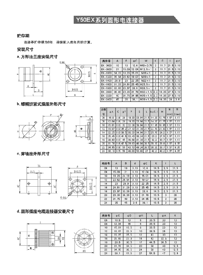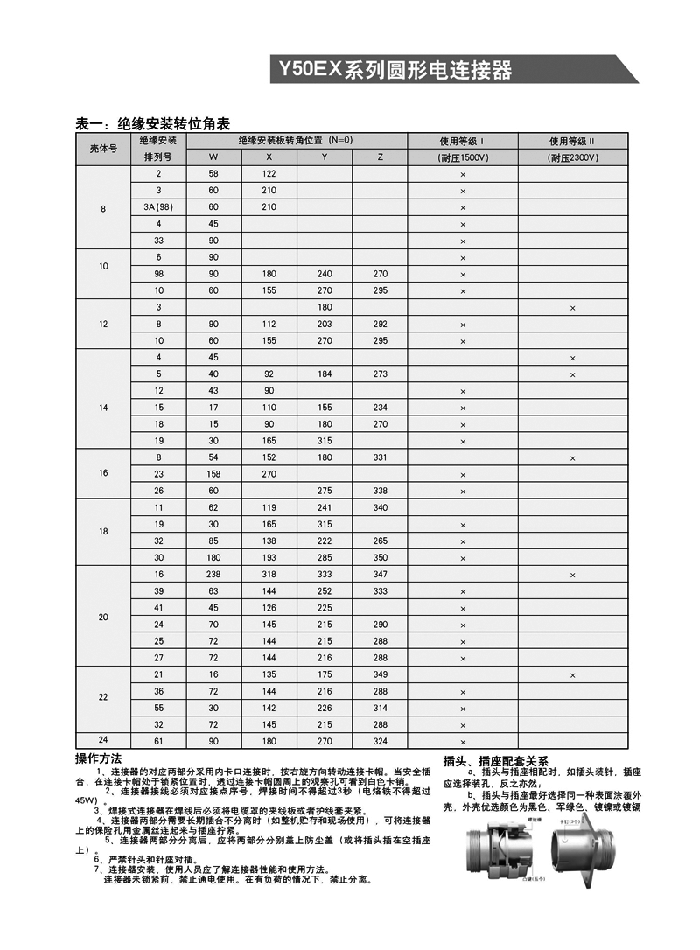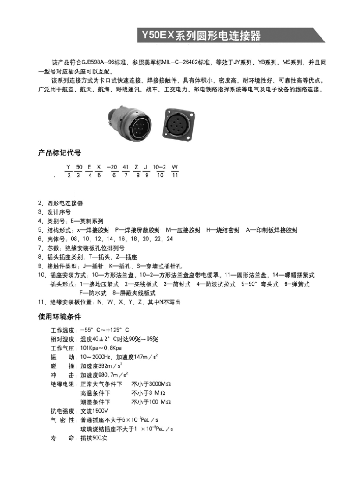 Y50EX系列圓形航空頭采用卡口式連接系統(tǒng),具有快速控接和快速分離,體積小、重量輕等特點(diǎn)。插頭有多種電纜安裝形式,即:電纜夾線板式、簡易封裝式、接地壓緊式、防波抗拉式、彎頭護(hù)線式、電纜話筒式和彈簧護(hù)線式等。電纜出線口備有各種規(guī)格不同的密封橡膠護(hù)線縣,能與電纜線緊密配接,增強(qiáng)了電纜線和連接器插頭的防雨、防水、防塵密封性和抗拉性能。接觸件焊接,殼體有屏蔽和非屏蔽以及多種鍍層可選,插座有一般密封和玻璃燒結(jié)密封等類觀,以適用不同的工作環(huán)境。適用于戰(zhàn)略戰(zhàn)術(shù)系統(tǒng),電子對(duì)抗系統(tǒng),野外作業(yè)電能,通訊信號(hào)連接系統(tǒng),航大航空航海通訊和測試跟蹤系統(tǒng),計(jì)算機(jī)系統(tǒng)、郵電鐵路指揮系統(tǒng),進(jìn)口醫(yī)療儀器設(shè)備等電能、電訊信號(hào)的近接。