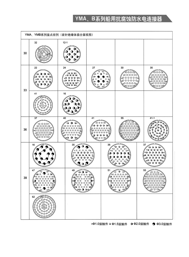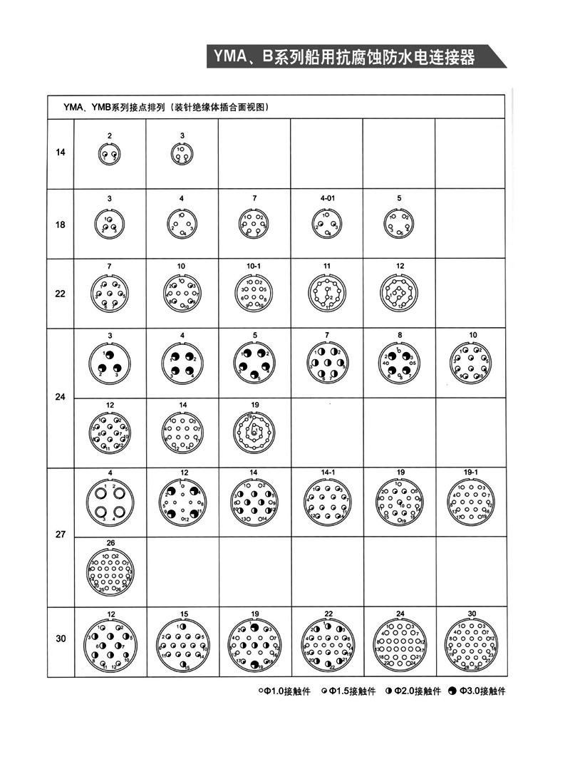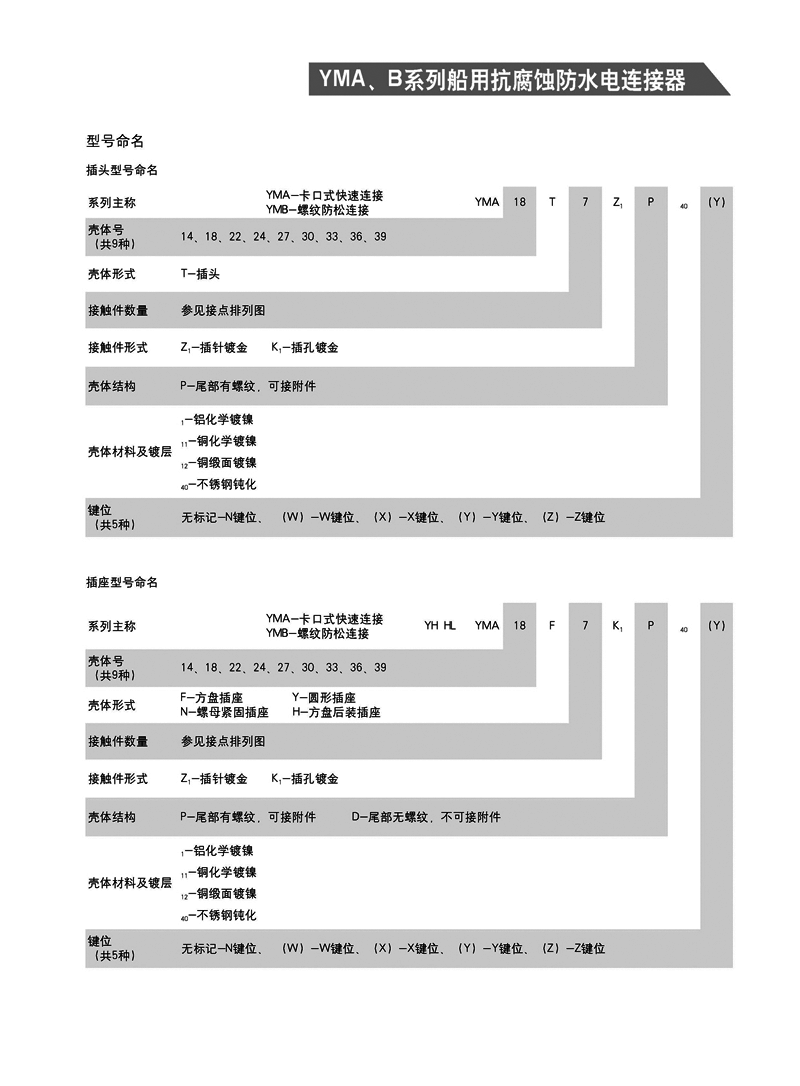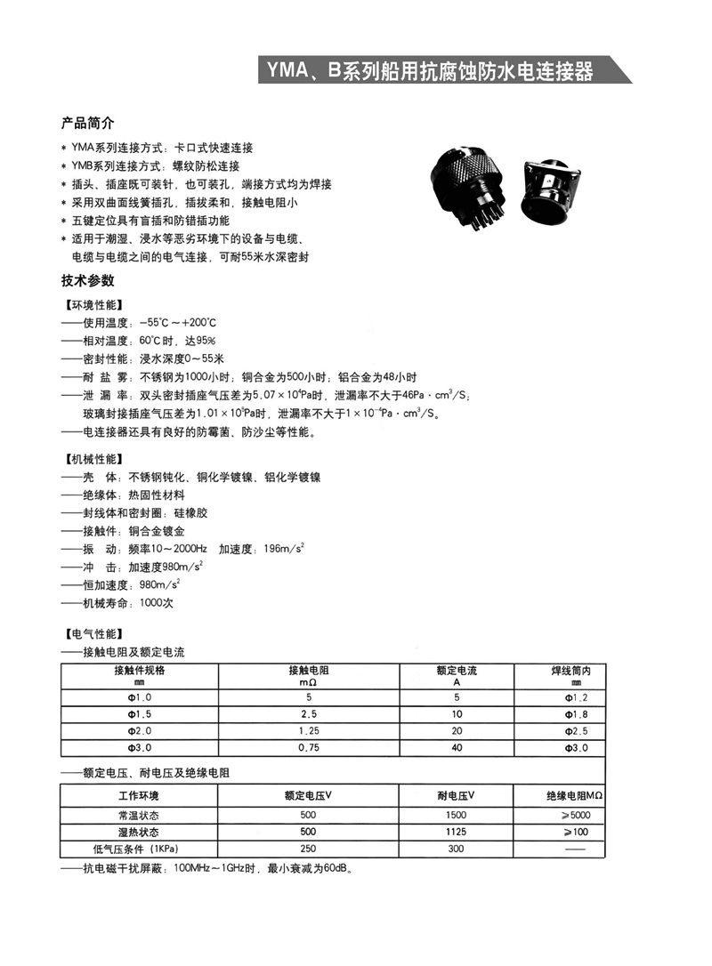 YMA YMB圓形防水防腐航空插頭,適用于濕熱、浸水等惡劣環(huán)境,可耐50米水深密封,耐1000小時鹽霧試驗:YMA系列為卡口式快速連接,YMB系列為螺紋防松連接,頭座均為焊接。 YMA、YMB系列船用抗腐蝕防水電連接器 1.【概 述】 * YMA系列—— 卡口式快速連接 * YMB系列—— 螺紋防松連接 * 適用于潮濕、浸水等惡劣環(huán)境下的設(shè)備與電纜、電纜與電 纜之間的電氣連接 * 可耐50米水深密封 * 插頭插座端接方式均為焊接 * 五鍵定位具有盲插和防錯插功能 * 高可靠的雙曲面線簧插孔使連接器插拔柔和,接觸電阻小 * 插頭、插座既可裝針,也可裝孔 http://m.sdpindao.cn/Product/yuanxinghangkongchatouhangkongjiechajian/
