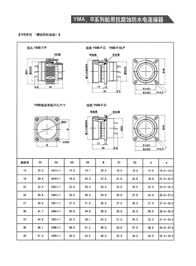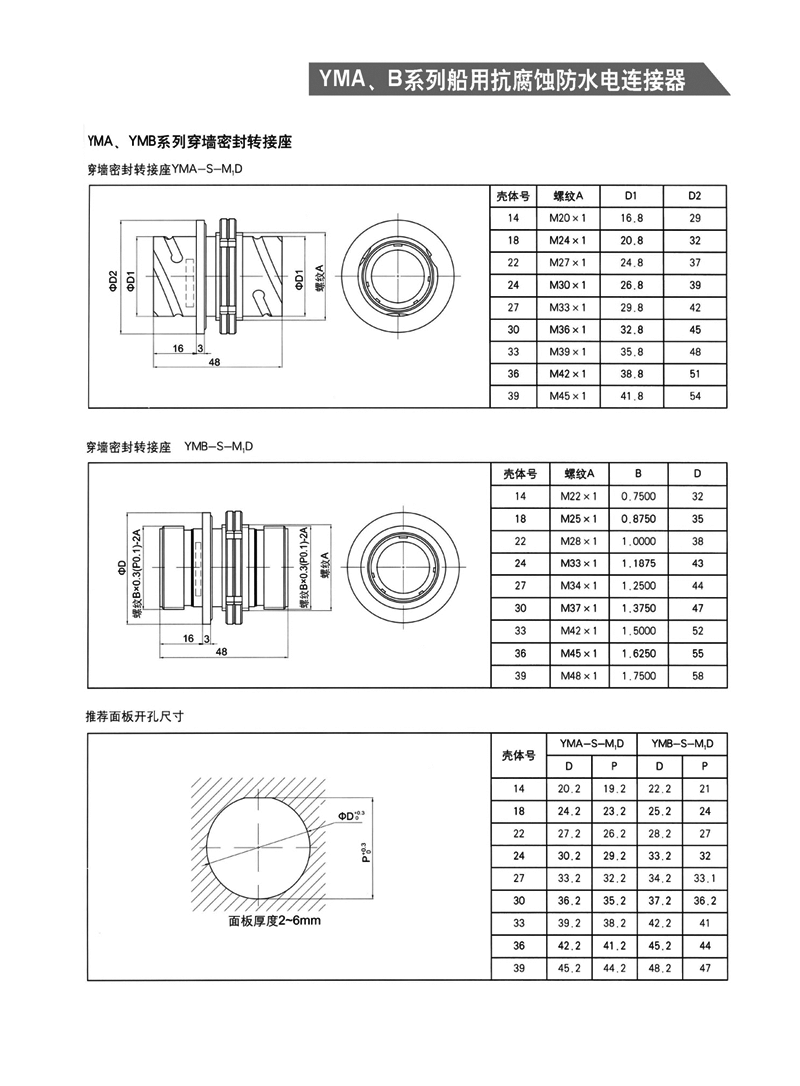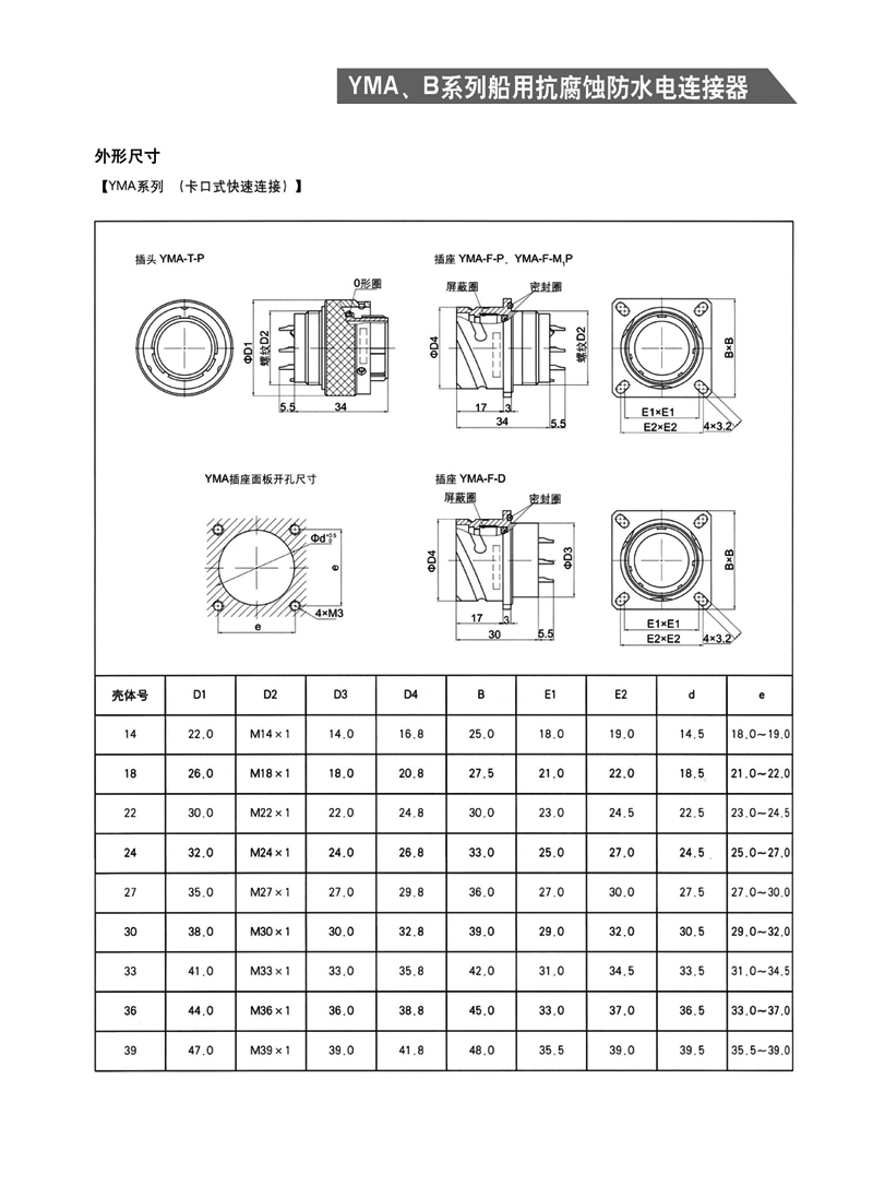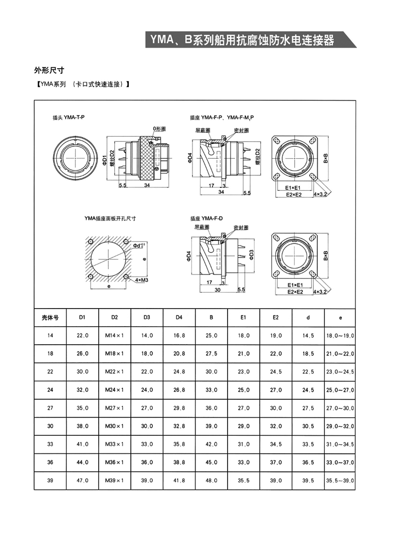YMA YMB圓形防水防腐航空插頭,適用于濕熱、浸水等惡劣環(huán)境,可耐50米水深密封,耐1000小時鹽霧試驗:YMA系列為卡口式快速連接,YMB系列為螺紋防松連接,頭座均為焊接。 YMA、YMB系列船用抗腐蝕防水電連接器 1.【概 述】 * YMA系列—— 卡口式快速連接 * YMB系列—— 螺紋防松連接 * 適用于潮濕、浸水等惡劣環(huán)境下的設(shè)備與電纜、電纜與電 纜之間的電氣連接 * 可耐50米水深密封 * 插頭插座端接方式均為焊接 * 五鍵定位具有盲插和防錯插功能 * 高可靠的雙曲面線簧插孔使連接器插拔柔和,接觸電阻小 * 插頭、插座既可裝針,也可裝孔 http://m.sdpindao.cn/Product/yuanxinghangkongchatouhangkongjiechajian/