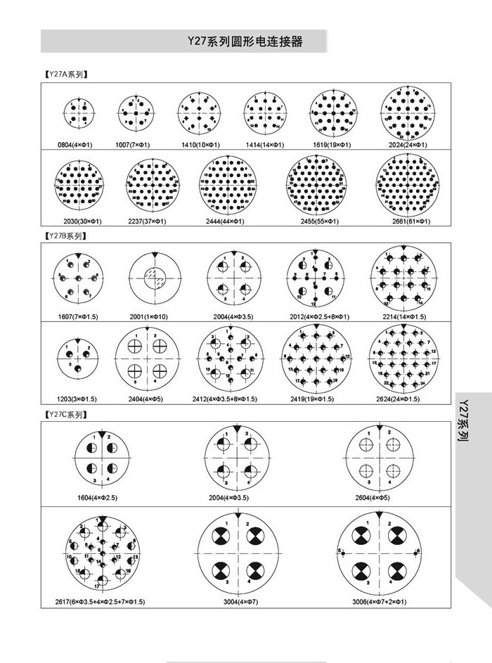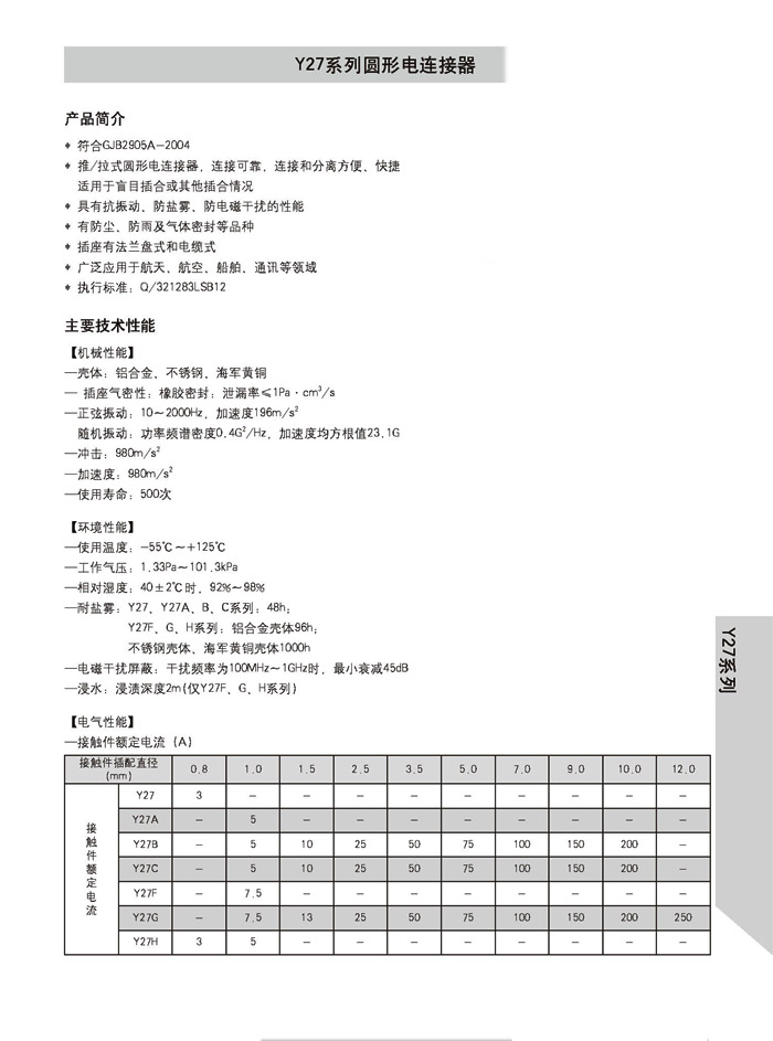 Y27系列推拉鎖緊式圓形電連接器,分好幾種型號(hào):Y27A,Y27B,Y27C,Y27F,Y27G,Y27H,排列 的芯譜不一樣,電流的大小不一樣, 適用于盲目插合,具有抗震動(dòng),防鹽霧,防電磁干擾的性能,有防層、防雨及氣體密封品種,符合國(guó)家軍用標(biāo)準(zhǔn)GJB2905A-2004 ,性能參照美軍標(biāo)MIL-C-3899.