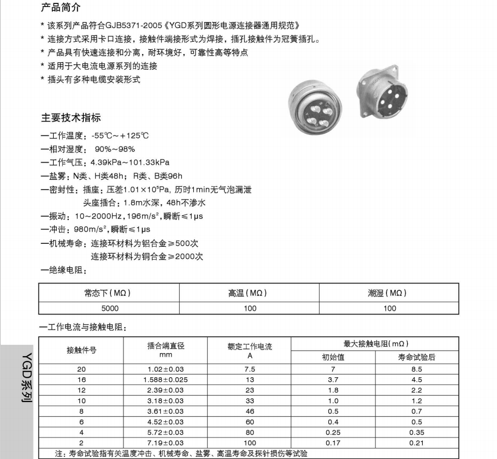 該系列電連接器是符合GJB5371-2005規(guī)范,適用于大電流電源系列的連接,現(xiàn)在的新能源汽車,電動(dòng)車,充電樁, 鋰電池,發(fā)動(dòng)機(jī)等電源設(shè)備的電流線路連接。芯數(shù)的多少不一樣,匹配的電流大小也不一樣,冠簧插孔,接觸面積廣, 插拔柔和,可靠連接。插頭和插座卡口連接,有二次鎖緊設(shè)計(jì)。