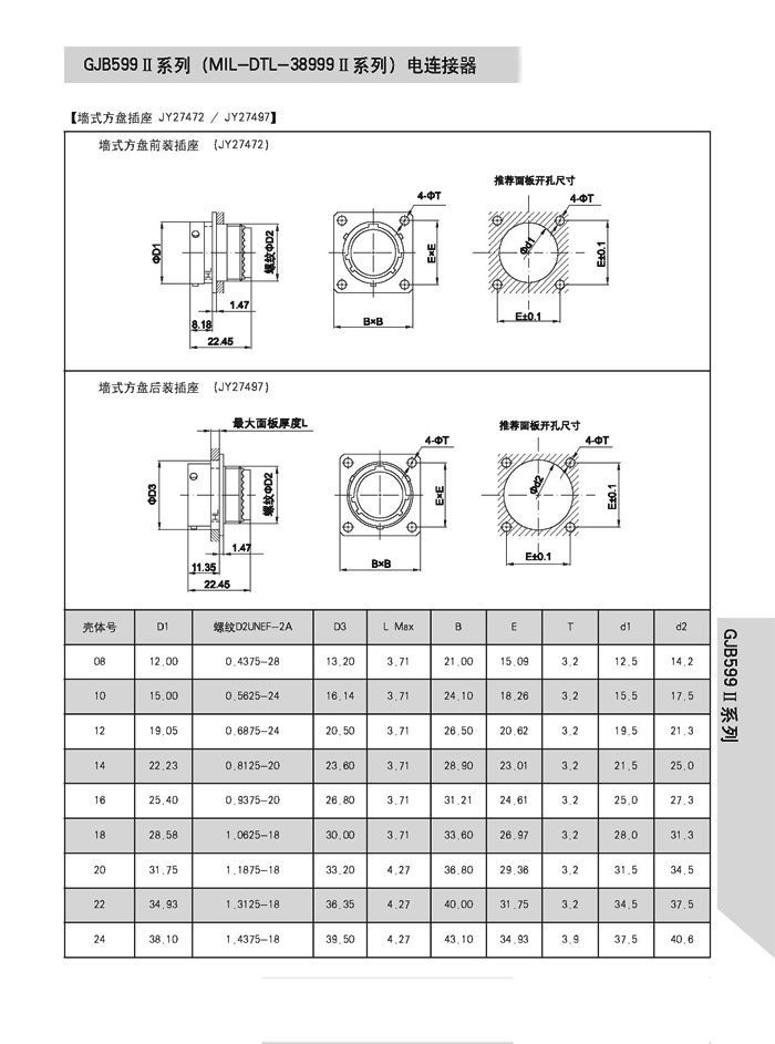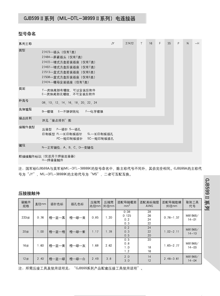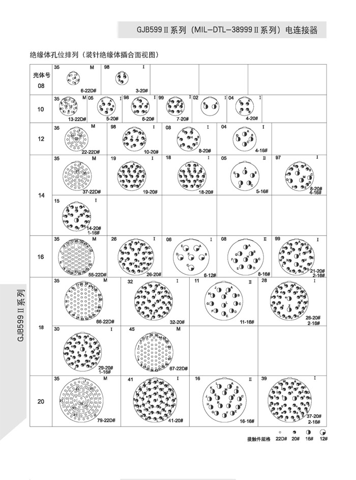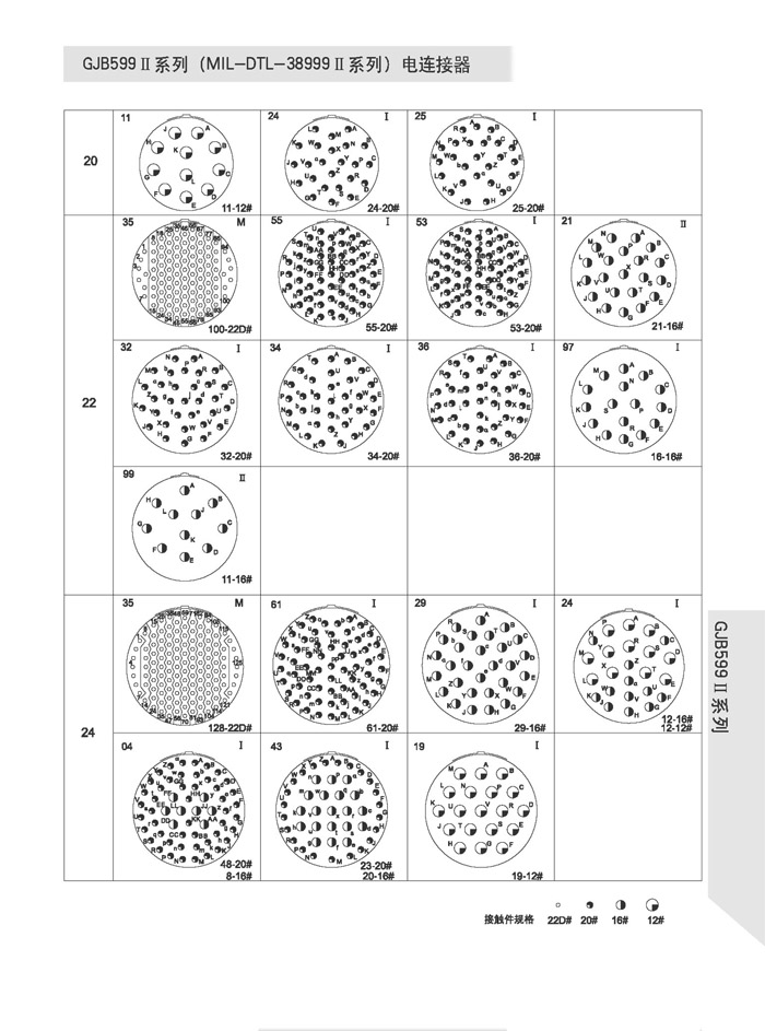 JY27472T2435PN圓形航空插頭,是GJB599系列里II型,JY是航空插頭的主稱號(hào),也可以命名MS。27472是航空插座組合代號(hào),墻式方盆前裝插座。T表示尾部有螺紋,可以安裝附件。24表示殼體號(hào)的大小,從08號(hào)——24號(hào)殼體,按照芯數(shù)的多少選用殼體。F是殼體的鍍層,鋁合金表面化學(xué)鍍鎳。35是芯譜,不是芯數(shù)的多少,要查看芯譜才知道,24F35是128芯。P是壓接插針,S表示壓接插孔。最后N表示鍵位,在同一個(gè)桌面有同樣多芯數(shù)的航空插頭,可以通過內(nèi)殼體旋轉(zhuǎn)角度定位,來防止誤插,錯(cuò)插,共有四個(gè)A,B,C,D鍵位選擇,整個(gè)型號(hào)命名解釋就是這樣,下圖是尺寸大小和芯譜。http://m.sdpindao.cn