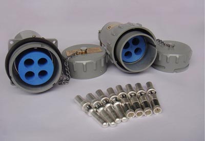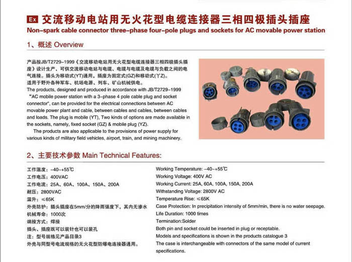 4芯300A防爆防火花航空電連接器,由插頭和插座兩部分組成,其中插頭為移動式(YT),插座有3種形式選擇:①面板固定式(GZ)、②移動式(YZ)和③斜式固定式。