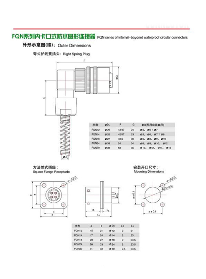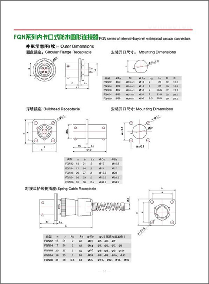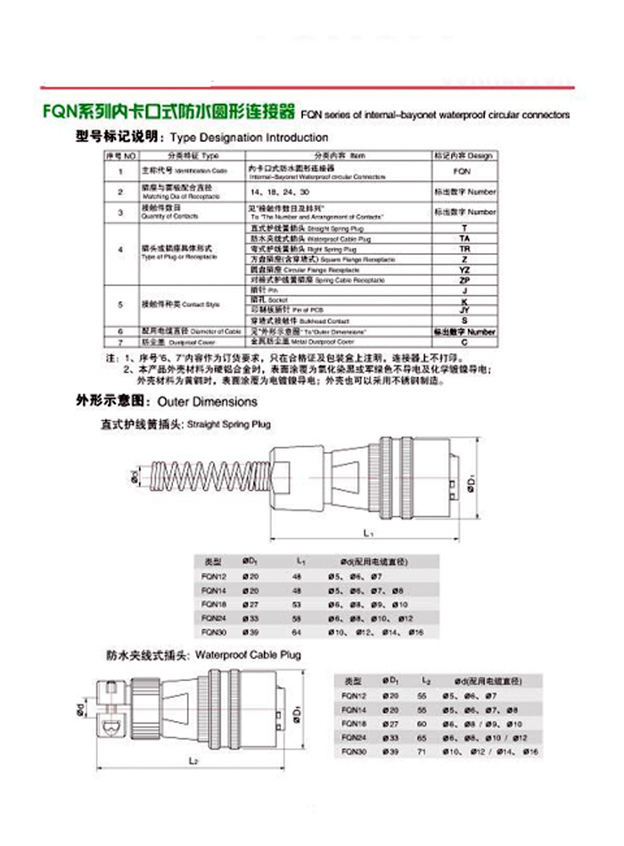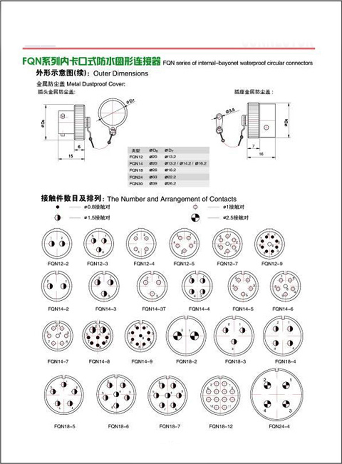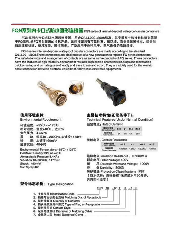 FQN型防淋雨防塵室外航空插頭座,符合Q/LLL002-2008標(biāo)準(zhǔn),產(chǎn)品價格的安裝尺寸及接點型譜等同F(xiàn)Q和Q系列產(chǎn)品價格,是FQ系列產(chǎn)品價格的改進型。體積小,重量輕,內(nèi)卡口快速連接,零件由鋁棒或銅棒車加工制造(非鋁壓鑄件),耐環(huán)境,防水、防鹽霧、防霉菌,操作使用簡便。插針、插孔引線采用焊接式。產(chǎn)品價格被廣泛使用于各種電子儀器、電子、電氣設(shè)備間有防水要求的電連接中。產(chǎn)品價格符合按鐵道部標(biāo)準(zhǔn)TB/T2761。產(chǎn)品價格針、孔可以根據(jù)您的要求互換。