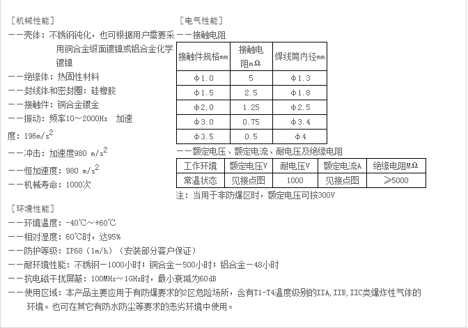 EX增安型防爆接插件,我公司先開發(fā)了4芯,8芯,12芯,15芯,32芯。有低電流,有高電流,插座有對接式,固定式。采用緊湊型 結(jié)構(gòu)設(shè)計,EXPlora系列系列防爆連接器一旦鎖緊環(huán)收緊后可達IP68等級的環(huán)境密封,不需要任何的補充密封。當(dāng)連接器沒有匹配使用時; 可以用帶高強度鋼絲繩的密封帽同樣可以達IP68等級。 螺母固定的接線端子可使用的導(dǎo)線最大達4mm2, 不需要任何特殊的工具進行安裝和拆卸。位置鍵槽可以防止錯誤的連接。線纜固定夾以及可替換的密封線纜圈的兩種設(shè)計可接受7mm-22mm直徑的線纜。 主要用在各種需要一個安全,可靠,容易分斷的連接的應(yīng)用。尤其是在易爆燃性氣體可能存在的制造廠的機器設(shè)備以及系統(tǒng)供電場合; 也用在石油化工行業(yè);包括磨坊,糧倉,油漆或油墨廠家,木材加工廠,水泥廠,船務(wù)和污水處理。 Bulgin(包錦)這款防爆連接器也適用于外部電器設(shè)備,如馬達,泵,燈光設(shè)備,過程控制裝置用在危險的廠家和工廠,或?qū)е乱兹? 氣體,蒸汽,薄霧氣體或易燃塵埃的爆炸環(huán)境。 |