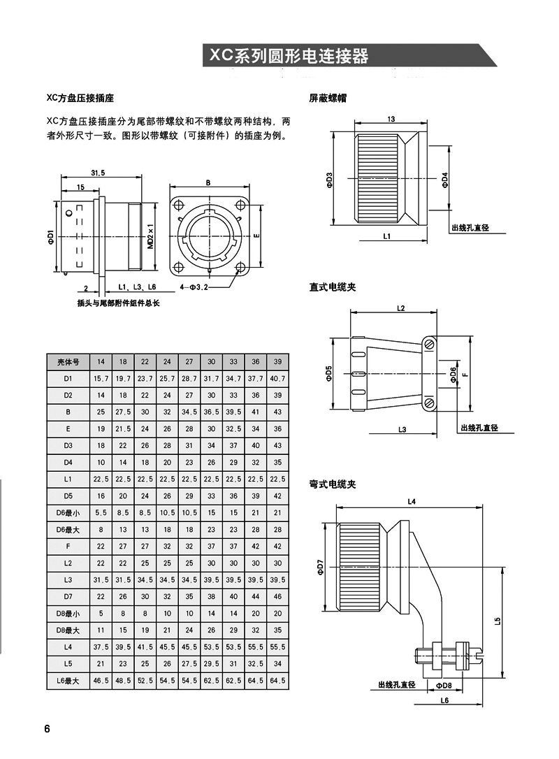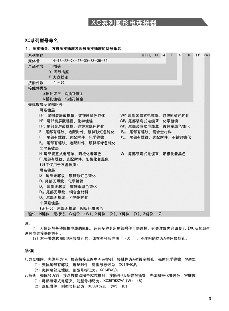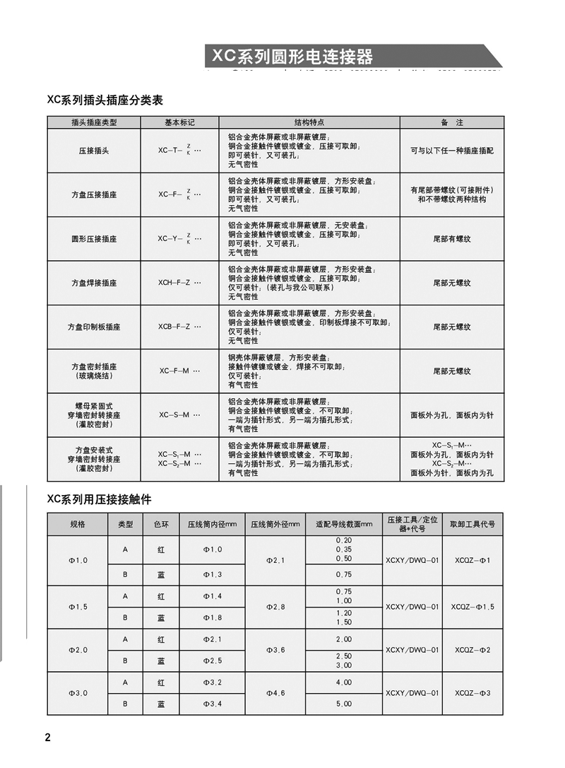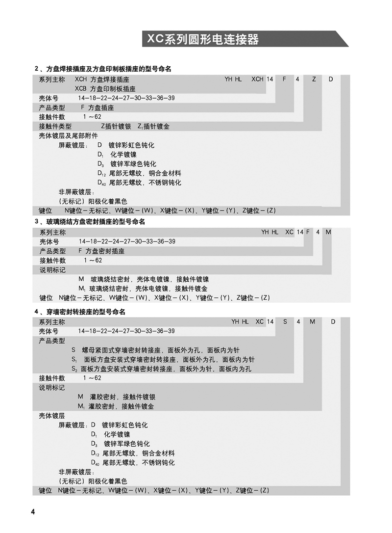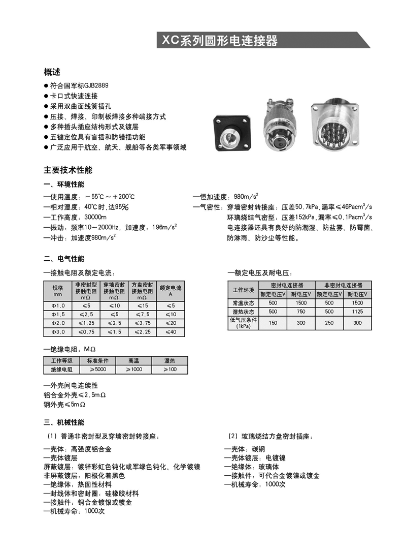 XC系列圓形航空插頭為低頻類電連接器。九種殼體號(hào);4種接觸件規(guī)格;32種孔位排列。從1孔到62孔。采用卡口式快速連接系統(tǒng),操作方便,連接可靠,耐振動(dòng),抗沖擊。五鍵槽定位,具有盲插和防誤插功能。高可靠的雙曲面線簧孔使連接器插拔柔和,接觸電阻小,工作可靠。插座共有五種結(jié)構(gòu)形式選用。XC系列圓形線簧孔信號(hào)電連接器,符合國家軍用標(biāo)準(zhǔn)GJB2889。廣泛用于航天,航空,航海、鐵路、野戰(zhàn)通訊及各種儀器、儀表等設(shè)備中。