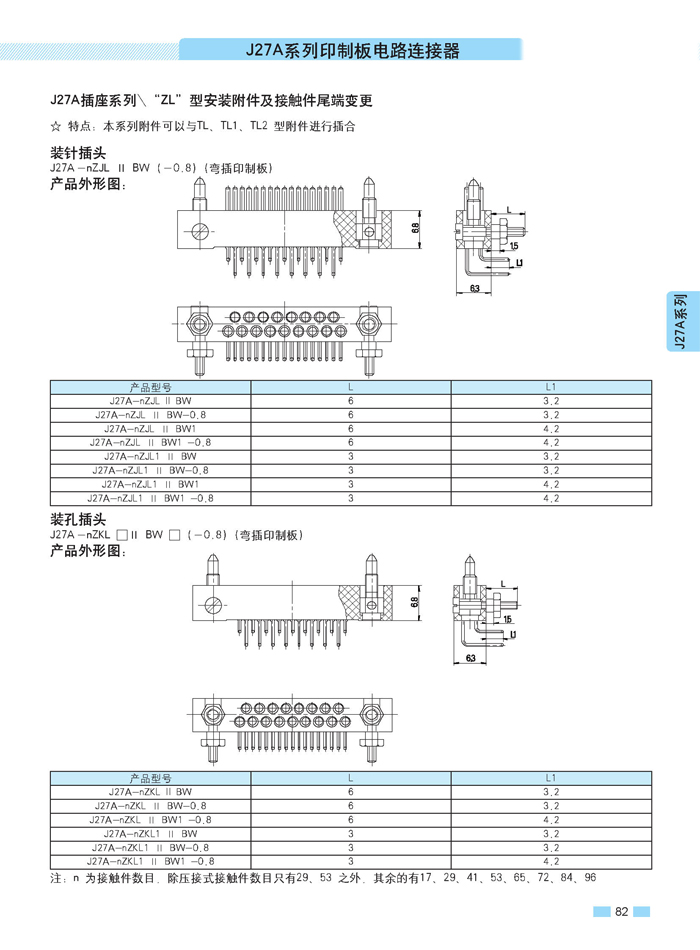 J27A系列印制板電路連接器,符合IEC130標(biāo)準(zhǔn)和MIL-C-55302標(biāo)準(zhǔn)要求,接觸數(shù)目有17,29,41,53,65,72,84,96芯等規(guī)格,連接器尾端端接形式分為直插印制板式、彎插印制板式、焊接式和壓接式,安裝鎖緊形式靈活,定位導(dǎo)向裝置有36種方位組合,具有很強(qiáng)的防誤插功能。http://www.jshkdz.com/product.asp?parentid=2