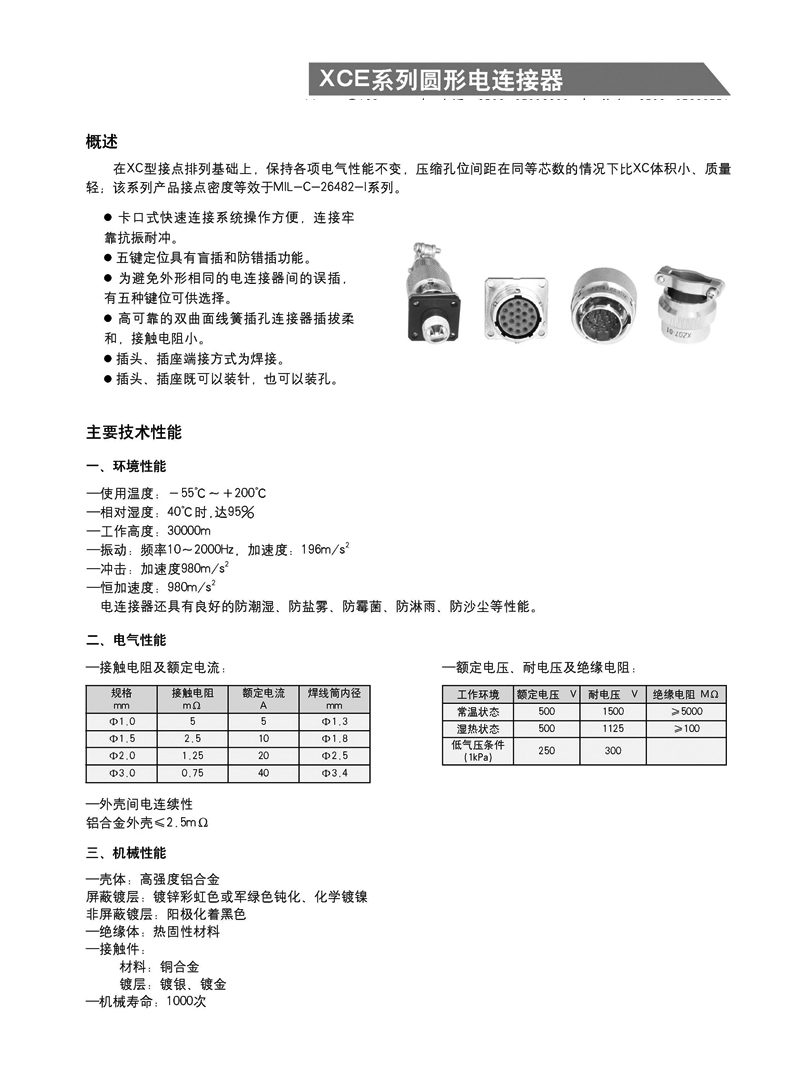 XCE系列軍用圓形電連接器,是在XC型譜排列基礎(chǔ)上,壓縮接點(diǎn)排列孔位間距,在相同接觸對(duì)數(shù)下比XC體積小,重量輕,殼體為高強(qiáng)度鋁合金材料,插頭、插座既可裝針也可裝孔,其連接方式為卡口式快速連接和分離,操作方便,連接可靠,抗振耐沖,接觸件有焊接式,其中插孔為線簧孔,具有插拔柔和、接觸電阻小、防潮、防鹽霧、防霉菌、防淋雨等特性,主要應(yīng)用于艦船等各種惡劣環(huán)境領(lǐng)域,也可應(yīng)用于航空、航天、兵器、野戰(zhàn)通信等軍事領(lǐng)域以及郵電通訊、鐵路指揮系統(tǒng)、計(jì)算機(jī)、航海和各種儀器、儀表的線路連接。
