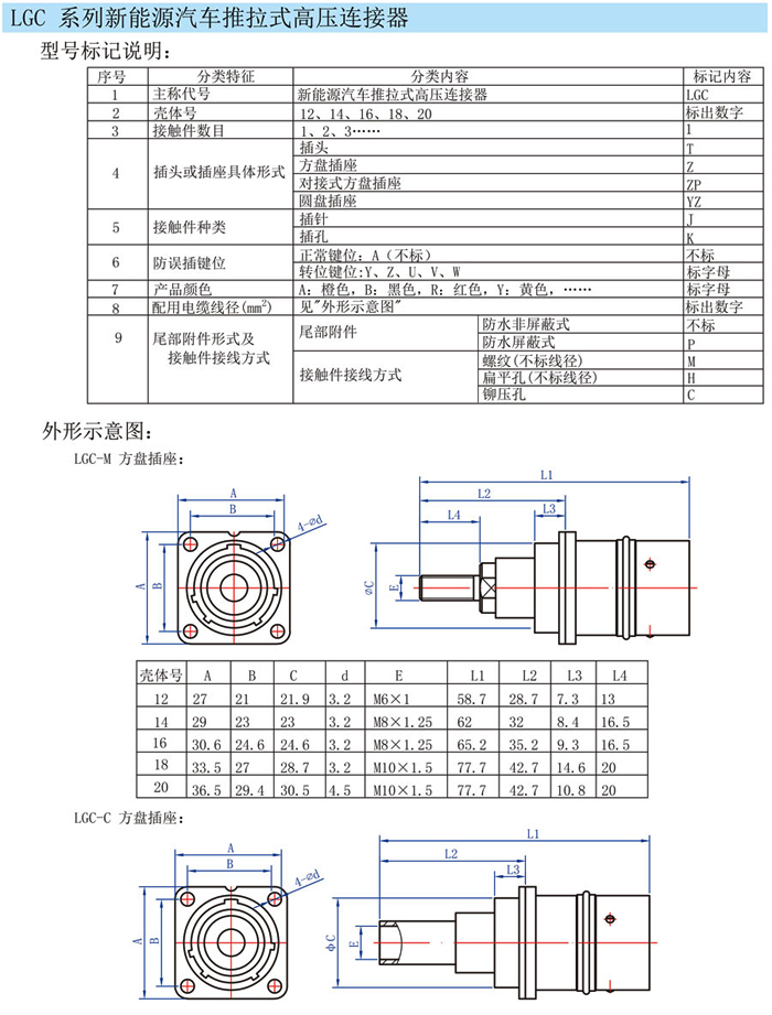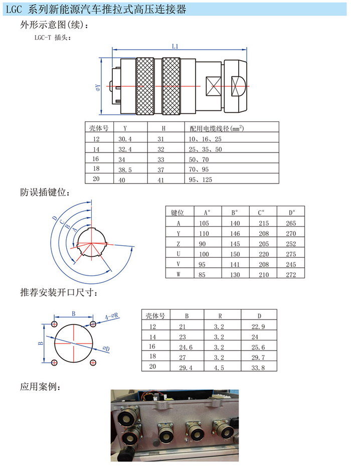 LGC汽車(chē)充電高壓直插連接器,用途廣泛,電動(dòng)汽車(chē),充電樁,新能源公交車(chē),單項(xiàng)輸送電流設(shè)備。該充電連接器電流大,可以接25mm2-50mm2線,電流125A-200A.顏色分紅,黑,藍(lán),預(yù)防插頭與插座的誤插,采用推拉插拔,方便快捷。