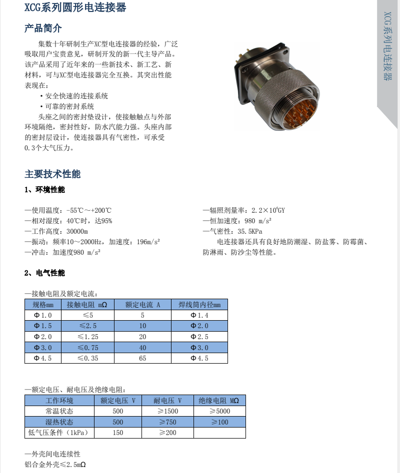 XCG系列電連接器在XC系列基礎上更新,有安全快速性的連接系統(tǒng),可靠的密封系統(tǒng),接觸點與外部環(huán)境隔絕,防水氣能強。