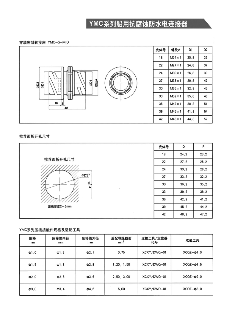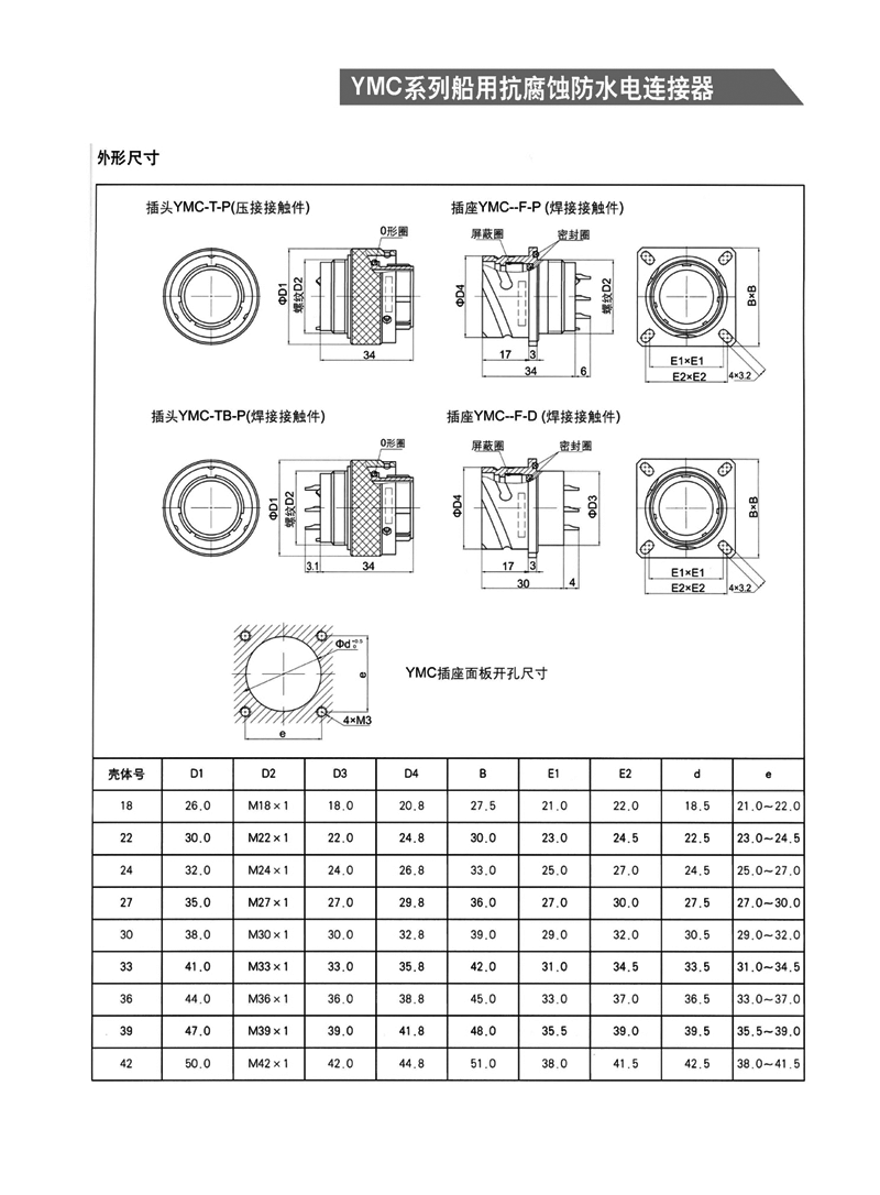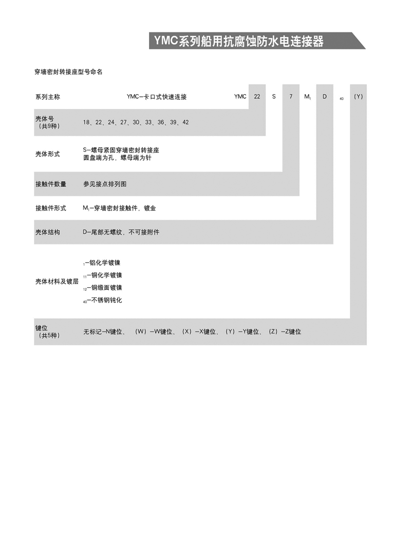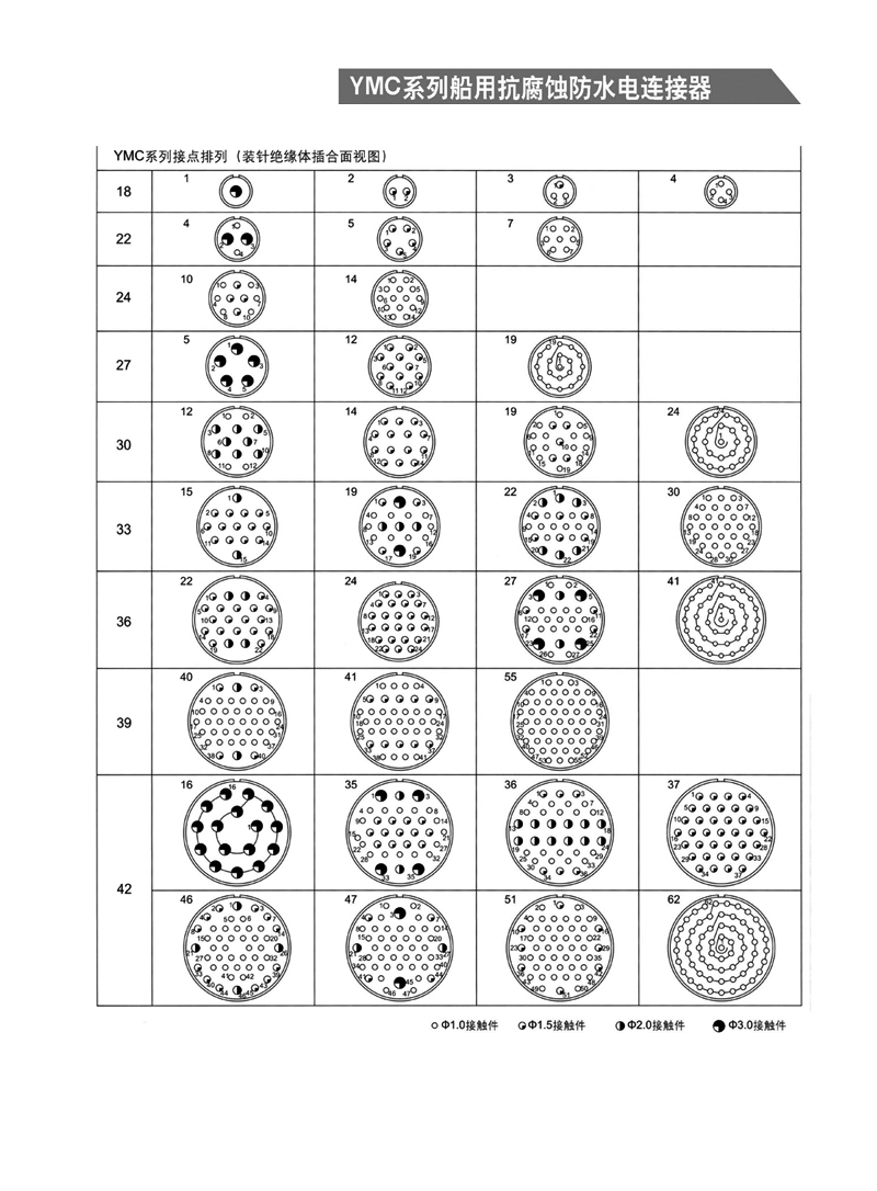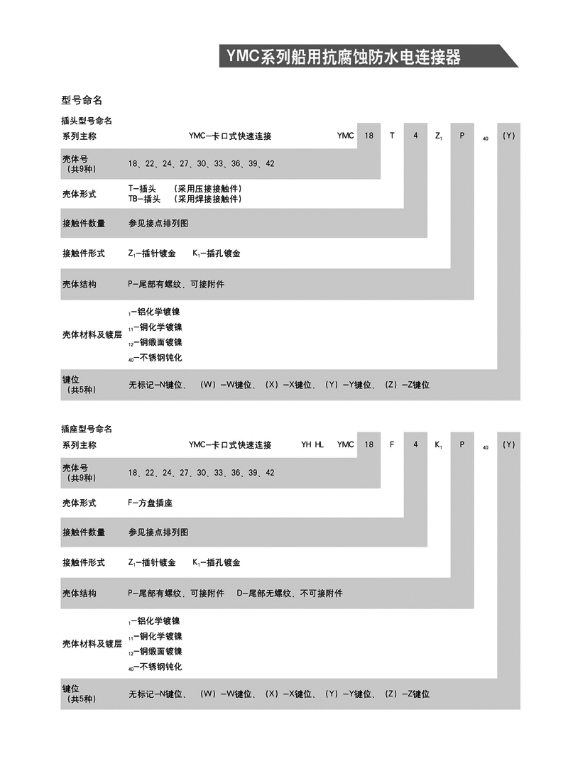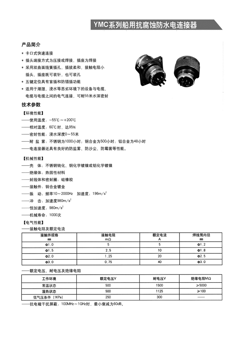 YMC系列船用抗腐防水電連接器, 1. 適用于潮濕、浸水等惡劣環(huán)境下的設(shè)備與電纜、電纜與電纜 之間的電氣連接 2. 可耐50米水深密封 3. 卡口式快速連接 4. 插頭端接方式為壓接,插座為焊接 5. 五鍵定位具有盲插和防錯插功能 6. 高可靠的雙曲面線簧插孔使連接器插拔柔和,接觸電阻小 7. 插頭、插座既可裝針,也可裝孔。