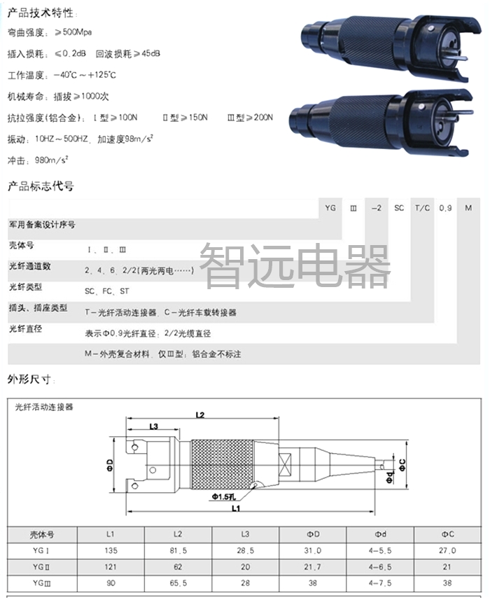 YG 4芯野外光纖(纜)連接器是光纖與光纖之間進(jìn)行可拆卸(活動)連接的器件,它把光纖的兩個端面精密對接起來,以使發(fā)射光纖輸出 的光能量能最大限度地耦合到接收光纖中去,并使由于其介入光鏈路而對系統(tǒng)造成的影響減到最小,這是光纖連接器的基本要求。目前分對 接式和固定式,相互之間都能互插。是一種符合GJB1919標(biāo)準(zhǔn)的多芯、中性光纜連接器,可以是SC、FC、ST的任一類型,其連接方式為卡口 式快速連接和分離結(jié)構(gòu),陶瓷套管定位,特別是外殼采用優(yōu)質(zhì)鋁合金材料或復(fù)合材料制成,具有抗振、耐壓、防鹽霧、防塵、防雨等性能, 廣泛應(yīng)用于軍用光纖通信網(wǎng)絡(luò)、軍用計算機(jī)系統(tǒng)、核電領(lǐng)域和多種車載、機(jī)載、艦載等設(shè)備。