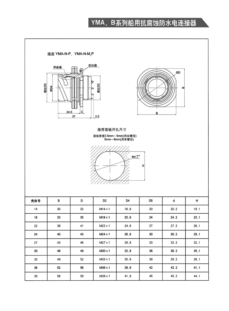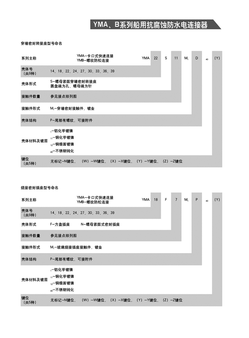 YMA/YMA系列船用防水航空插頭適用于濕熱、浸水等惡劣環(huán)境,可耐50米水深密封,耐1000小時鹽霧試驗:YMA系列為卡口式快速連接,YMB系列為螺紋防松連接,頭座均為焊接。 適用于潮濕、浸水等惡劣環(huán)境下的設備與電纜、電纜與電纜之間的電氣連接。